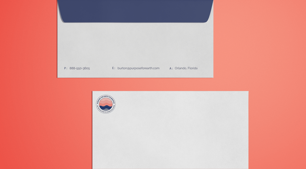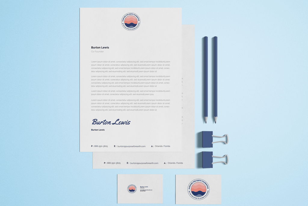 Purpose for Earth Foundation is a nonprofit organization with a mission to keep oceans plastic free. They are also passionate about saving marine life like sea turtles and coral reefs. I was tasked with making them a new logo and branding identity. The idea behind the logo was inspired by the ocean because all the work they do has to do with marine life and oceans. The orange color above the ocean waves is a nod to the organization's cause to protect coral reefs.